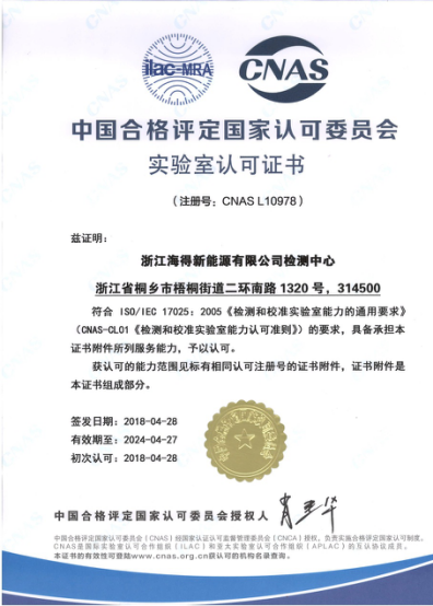 浙江海得新能源有限公司检测中心通过CNAS实验室认可,一举跻身国家认可实验室行列